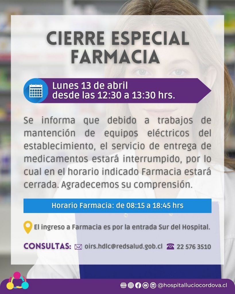 Informamos a nuestra comunidad usuaria y público en general, que el servicio de Farmacia del Hospital tendrá una interrupción temporal en su atención el próximo lunes 11 de abril.