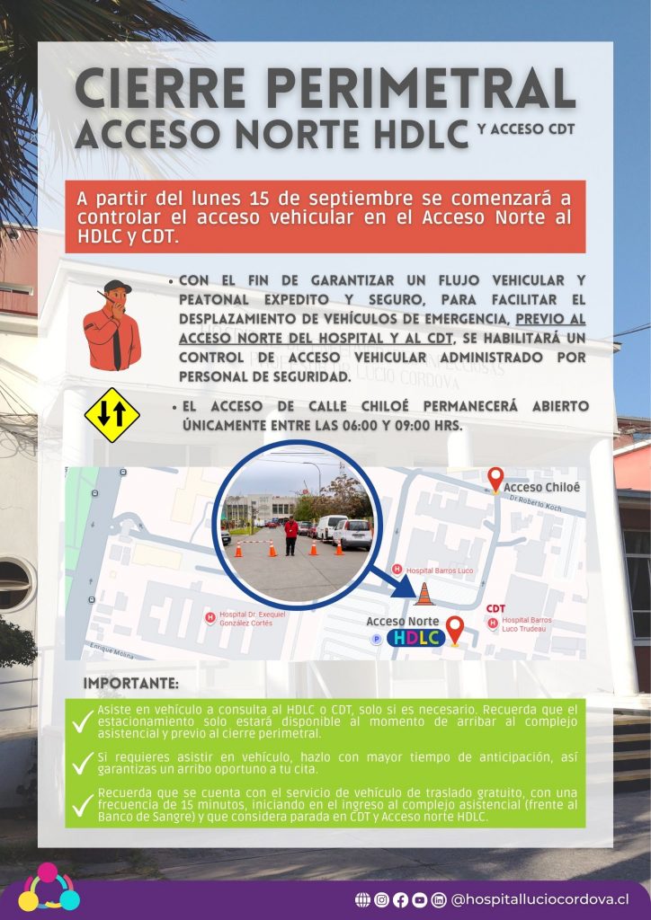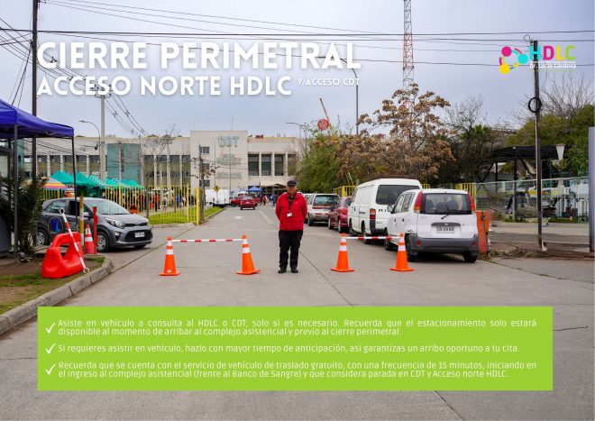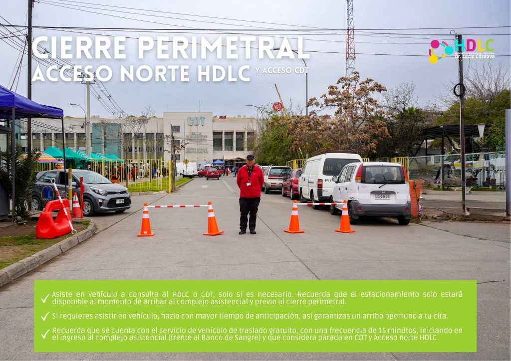 - Estacionamiento: para quienes asisten a consulta ambulatoria será únicamente en los sectores previos al cierre perimetral (reja amarilla), recuerda que la entrada para este tipo de atención en el HDLC es por el acceso sur (admisión).