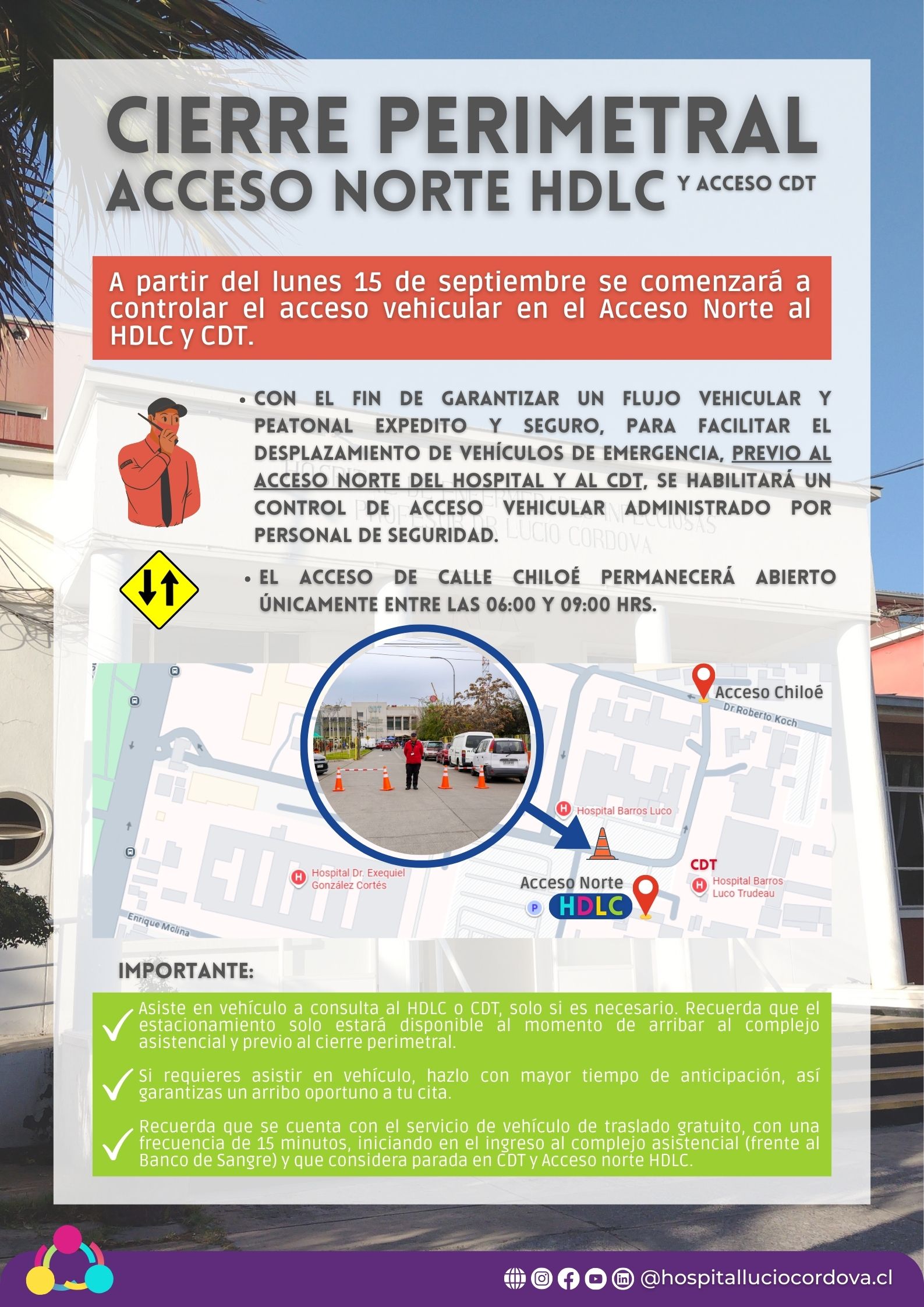 - Control de Acceso: habilitación de un control de acceso administrado por personal de seguridad del centro asistencial previo al área de atención ambulatoria y la apertura del acceso de calle Chiloé sólo entre 6.00 y 9.00 horas. Te agradecemos seguir las indicaciones de nuestro personal de seguridad.