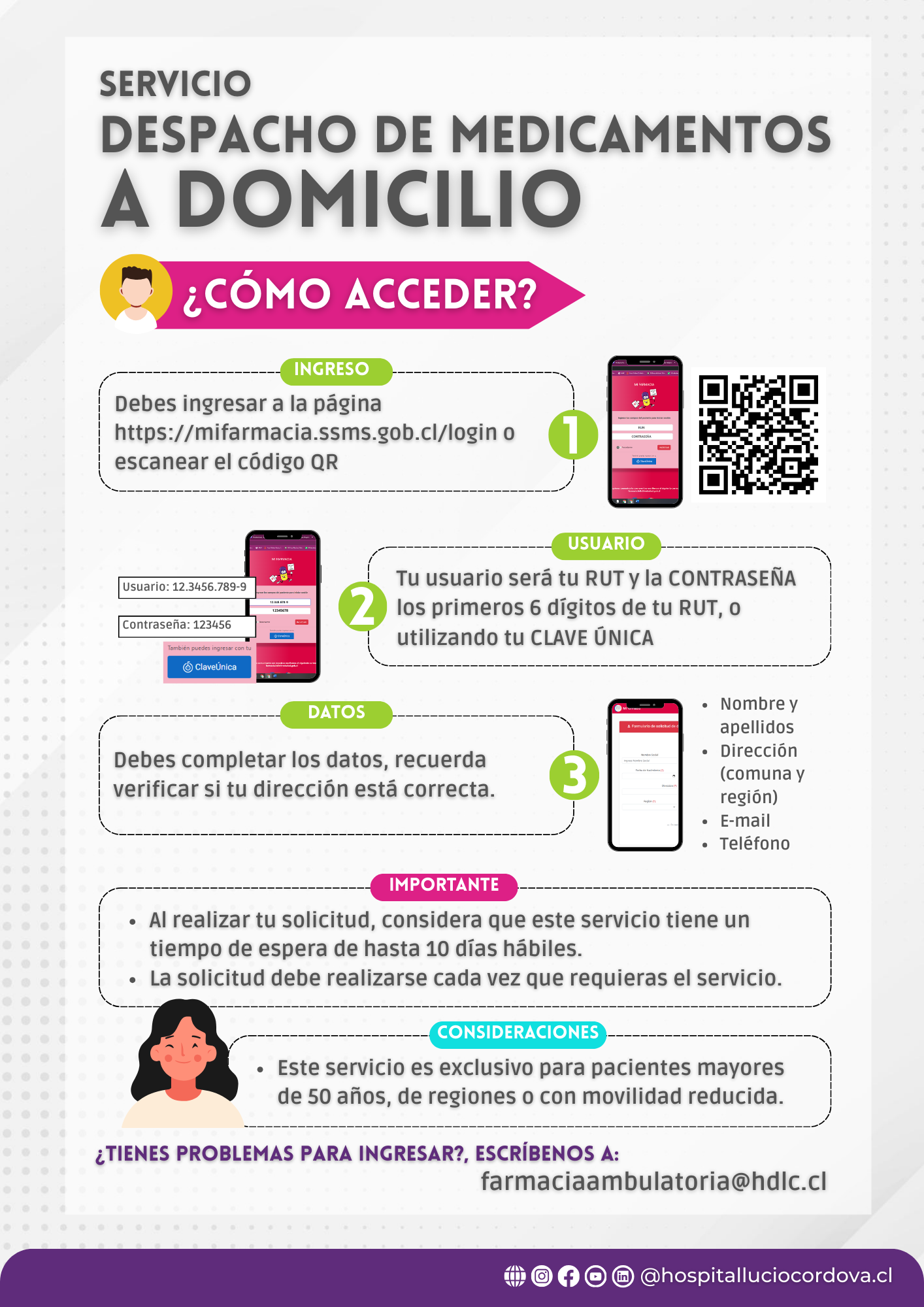 Si presentas dificultades técnicas con la plataforma, puedes escribirnos directamente al correo: farmaciaambulatoria@hdlc.cl.